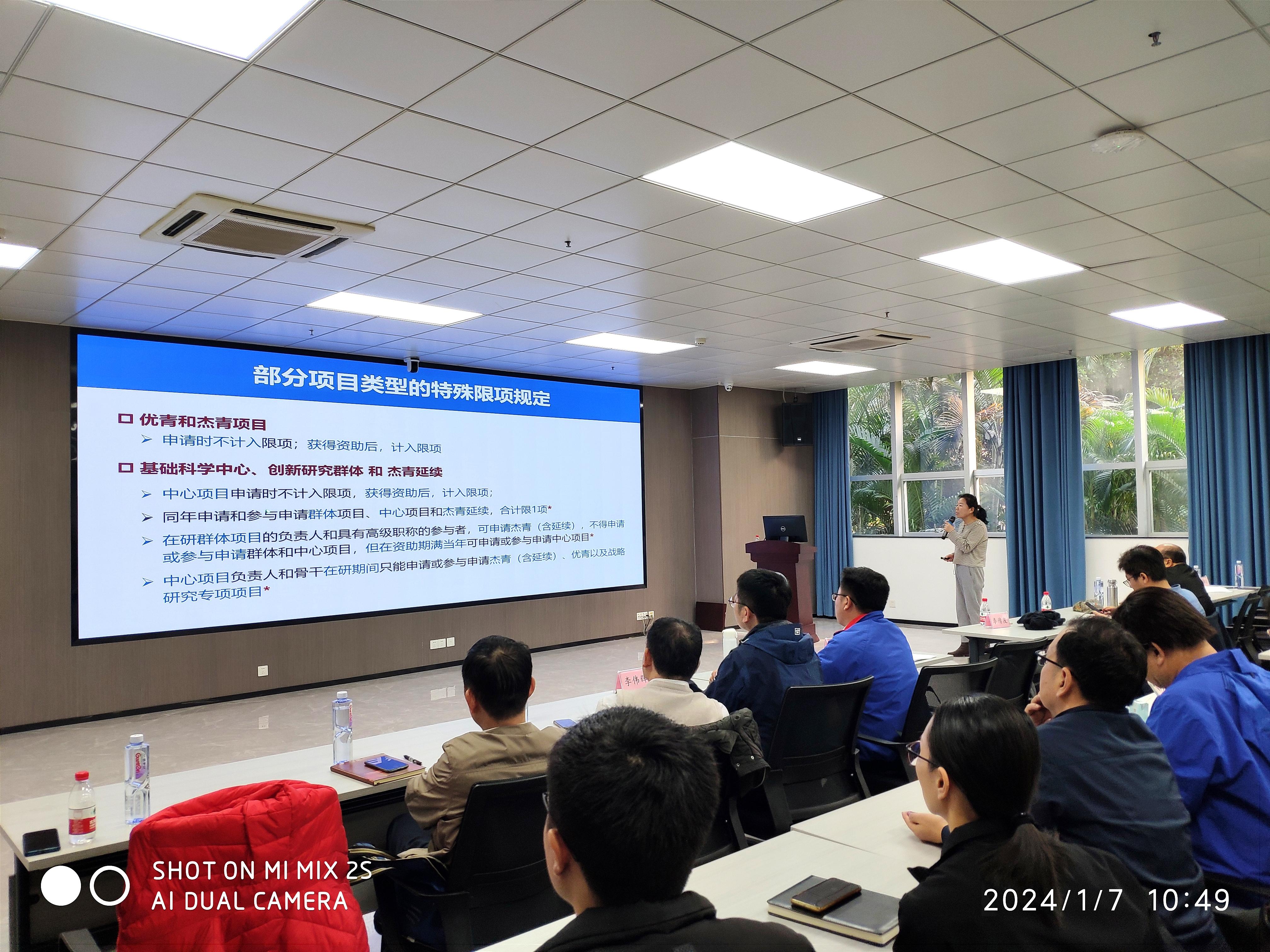 祁敏杰主管则详细介绍了基金项目类型及申请规定、2023年度基金申请资助情况、2024年度基金政策调整和基金申请系统填报等内容。重点介绍了最新动态基金申报以及形式审查要点。