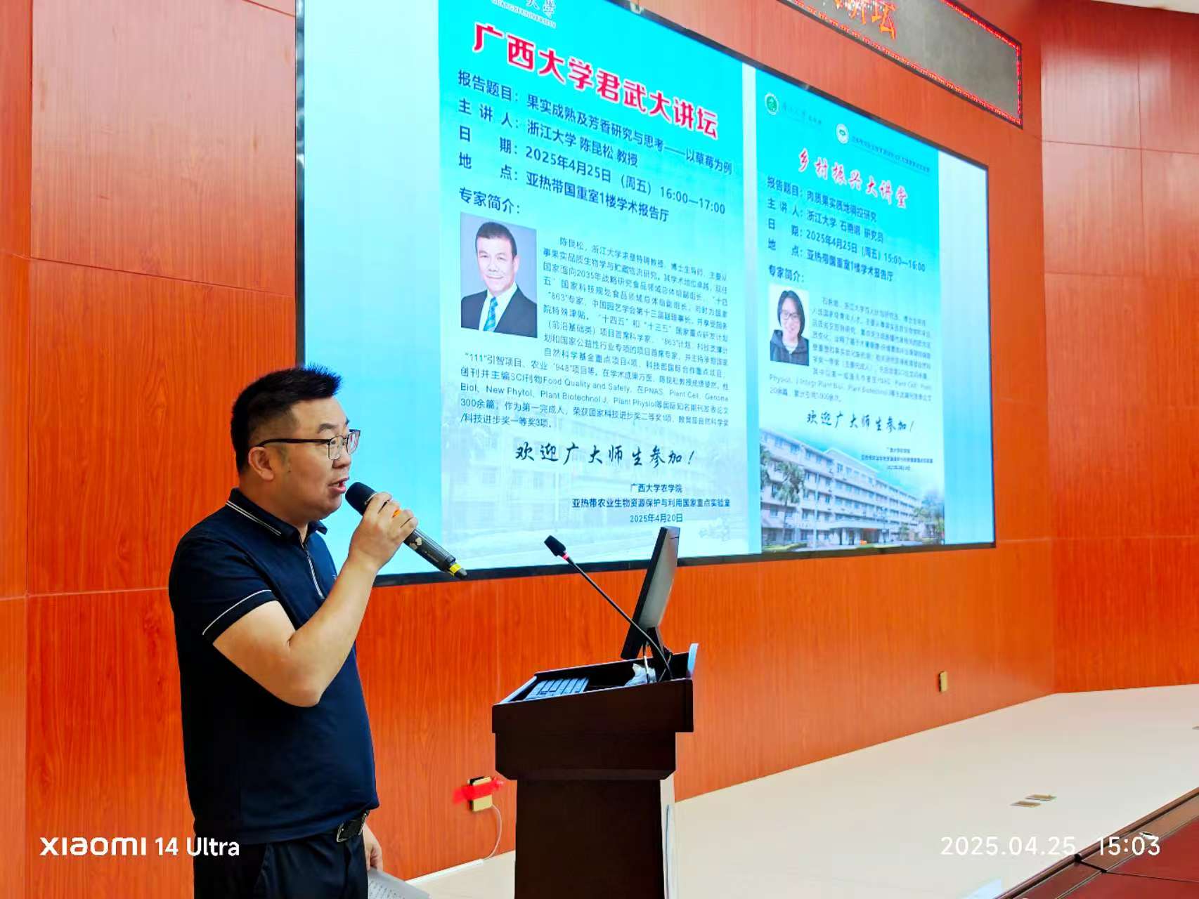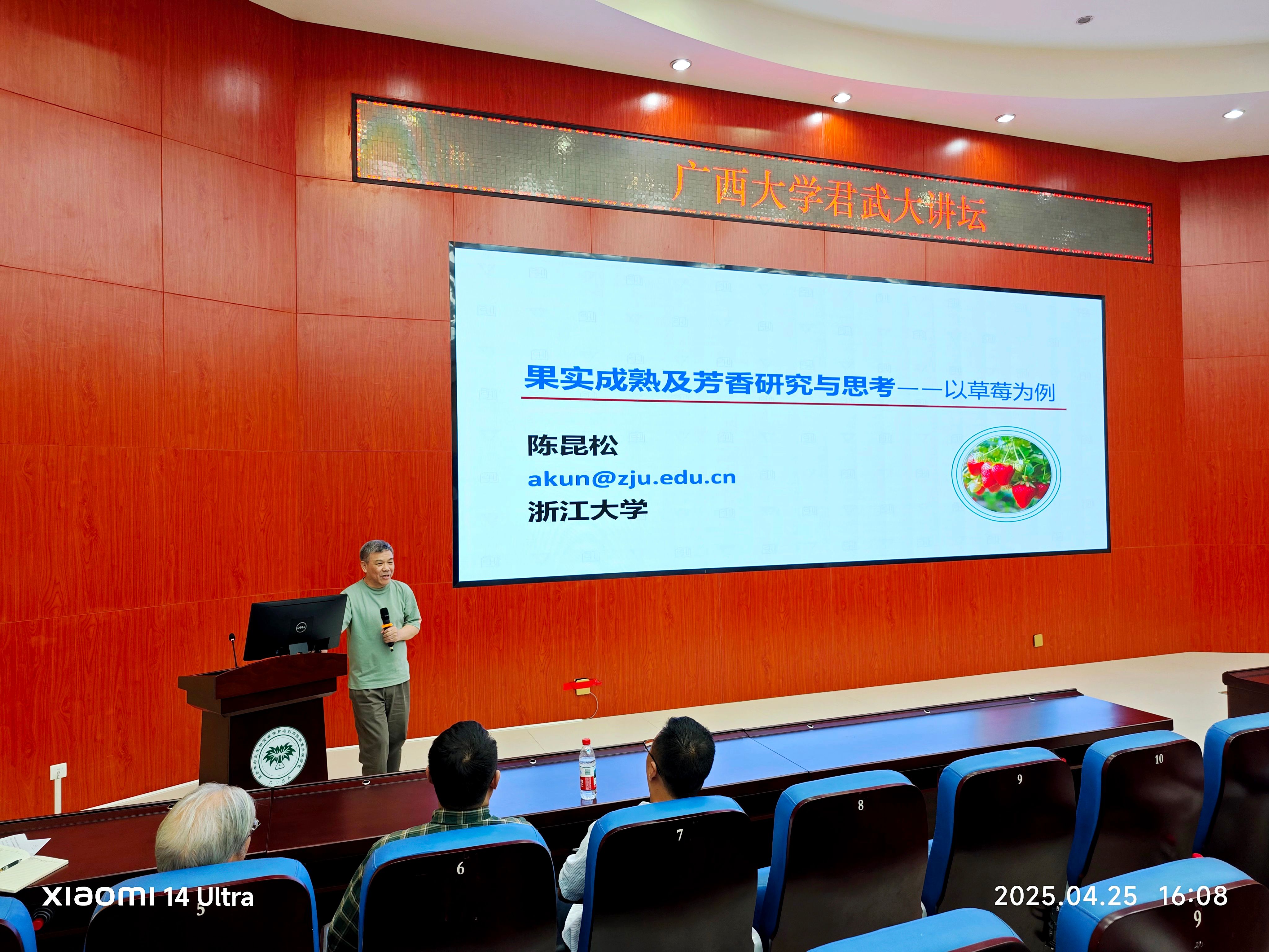 4月25日,浙江大学求是特聘教授陈昆松和浙江大学百人计划石艳娜研究员应邀到公司,开展了一场精彩纷呈的学术交流活动。陈昆松教授在君武大讲坛上,以“果实成熟及芳香研究与思考——以草莓为例”为主题进行了深度分享,石艳娜研究员则做客公司乡村振兴大讲堂,为师生作了题为“肉质果实质地调控研究”的学术报告。此次活动吸引了db真人体育官网、亚热带农业生物资源保护与利用国家重点实验室(亚热带国重室)、生命科学与技术公司、轻工与食品工程公司等多个公司的200余名师生参与聆听,报告会由亚热带国重室主任兼db真人体育官网经理张积森教授主持。