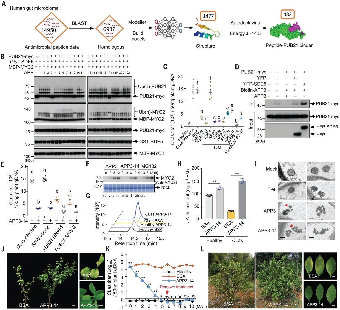 2025年4月11日,中国科公司微生物研究所叶健研究员团队在《Science》杂志以封面文章形式在线发表题为Targeted MYC2 stabilization confers citrus Huanglongbing resistance的研究成果。该研究首次系统性解析了柑橘应对黄龙病(Huanglongbing, HLB)的核心分子机制,揭示了由E3泛素连接酶PUB21与转录因子MYC2构成的抗性遗传调控网络。基于机制解析,该团队通过人工智能辅助筛选技术鉴定出双功能肽APP3-14,该小肽可特异性稳定MYC2蛋白并阻断其泛素化降解。田间验证显示,APP3-14能显著抑制黄龙病病原菌扩散,单季防控效率达80%,且对柑橘植株生长无不良影响。这一发现阐明了植物-病原互作的新模式。值得注意的是,该研究中小肽APP3-14的研发及其田间应用为黄龙病的绿色防控提供了创新性解决方案,不仅丰富了现有的防控手段,还为以小肽为核心的新一代绿色农药研发注入了强劲动力,有望加速相关领域的技术突破与产业化进程。