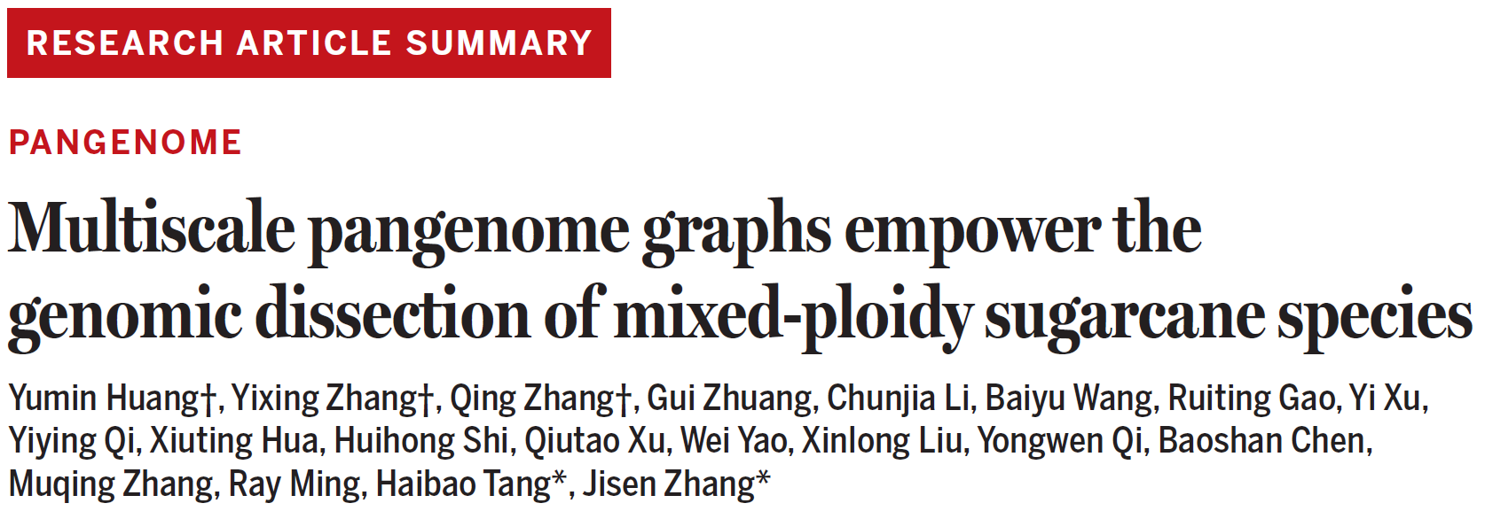 北京时间2026年2月6日,db真人体育官网、广西甘蔗生物育种实验室、亚热带农业生物资源保护与利用国家重点实验室张积森教授团队牵头,联合福建农林大学等单位,在国际顶级学术期刊《科学》(Science)在线发表题为《Multiscale pangenome graphs empower the genomic dissection of mixed-ploidy sugarcane species》的研究论文(Research Article)。该研究首次提出并实现了多倍体感知的多尺度(基因组—基因—蛋白)图形泛基因组(graph pangenome)分析框架,为复杂多倍体作物的遗传解析与分子育种提供了关键技术突破,具有重要的科学意义和产业应用价值。这一成果是张积森团队围绕甘蔗生物育种为主线,以甘蔗基因组—种质资源演化—多倍体遗传—重大育种价值基因挖掘为研究链条,继2018年(Zhang et al., Nature Genetics)、2022年(Zhang et al., Nature Genetics)、2023年(Wang et al., Nature Plants)、2025年(Zhang et al., Nature Genetics)等一系列系统代表性成果之后,在该领域取得的又一重大进展。