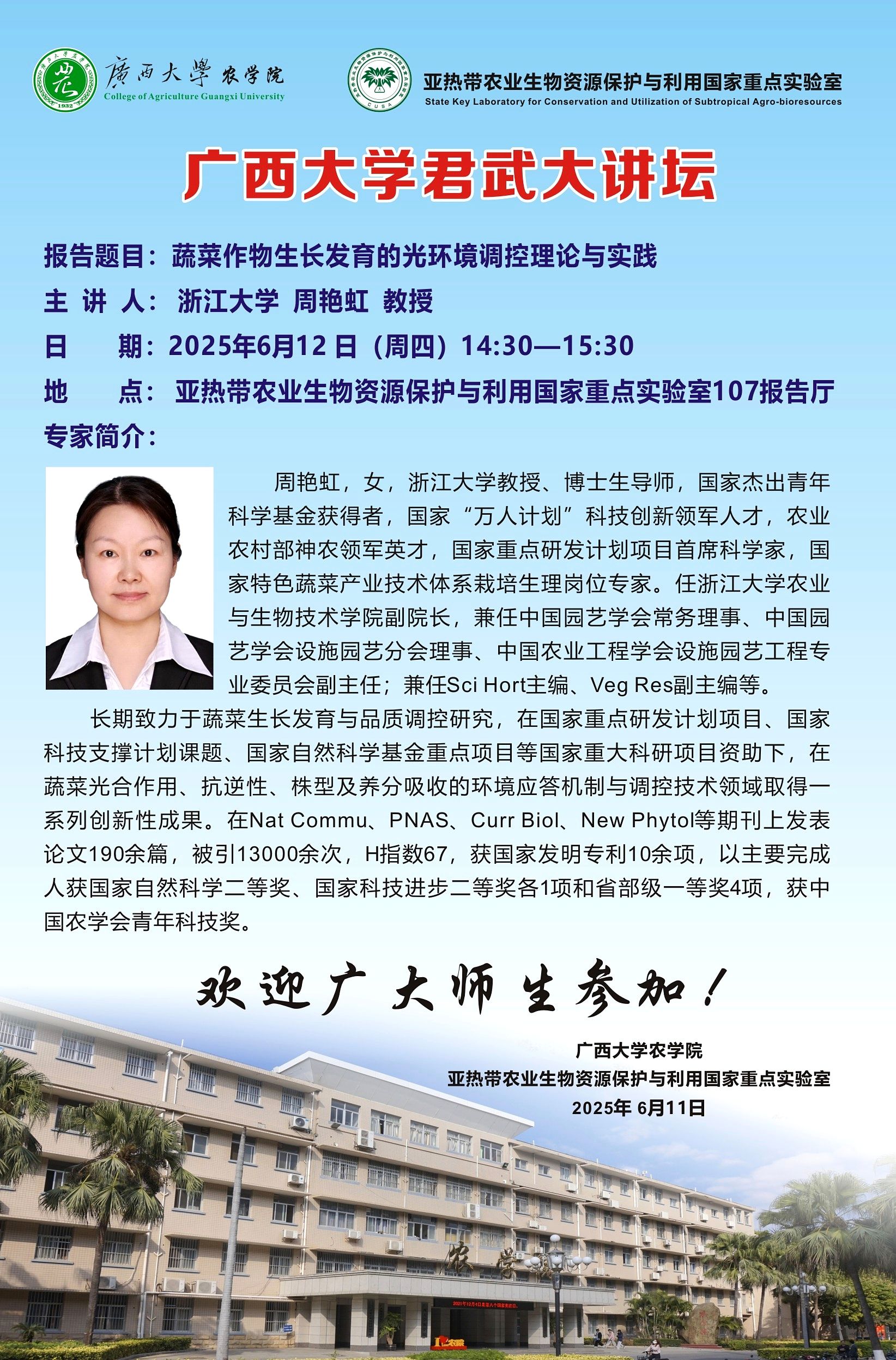 DB视讯君武大讲坛-蔬菜作物生长发育的光环境调控理论与实践主讲人:浙江大学周艳虹教授