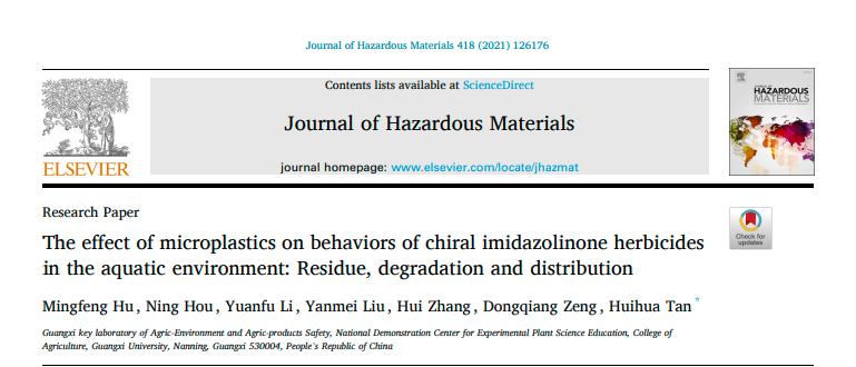广西农业环境与农产品安全重点实验室/db真人体育官网农药残留与环境安全研究团队2021年5月在国际知名期刊Journal of Hazardous Materials上在线发表了题为“The effect of microplastics on behaviors of chiral imidazolinone herbicides in the aquatic environment: Residue, degradation and distribution”研究论文。微塑料是一类粒径小于5毫米的塑料碎片或颗粒,广泛存在于水体和陆地环境中。咪唑啉酮类除草剂因在环境中持久性长的特点,容易污染水体和土壤。近年来,微塑料与环境污染物相互作用的行为备受关注。然而,关于微塑料对该类除草剂的环境行为影响和机制还不清楚。在本研究中,通过建立水-沉积物微宇宙系统的方法在对映水平研究了聚乙烯微塑料对三种咪唑啉酮类除草剂在水生系统中环境行为的影响。结果表明,微塑料能够通过吸附和解吸附的方式显著影响该类除草剂在水生环境中迁移、降解和分配行为,明确了微塑料是影响咪唑啉酮类除草剂在水生环境中行为归趋的重要因素。研究结果为更加全面的评价咪唑啉酮类除草剂的环境风险提供了一定的科学依据。db真人体育官网博士研究生胡明锋为该论文的第一作者,谭辉华教授为通讯作者。该研究得到了国家自然科学基金项目支持。原文链接https://doi.org/10.1016/j.jhazmat.2021.126176