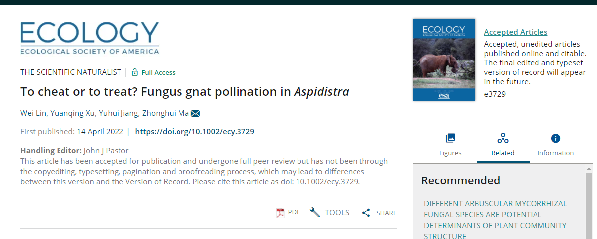 研究成果以“To cheat or to treat? Fungus gnat pollination in Aspidistra”为题于2022年4月14日在线发表在生态学领域经典期刊《Ecology》上。db真人体育官网硕士研究生林威为该论文的第一作者,中国科公司昆明植物研究所博士研究生徐苑卿为共同第一作者,马仲辉副教授为通讯作者,DB视讯为第一作者单位。