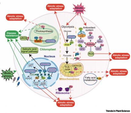 赖氨酸短链酰基化作为一类高度动态的表观遗传修饰,被证实广泛地调控着植物的生长发育与逆境适应。研究表明,赖氨酸短链酰基化在植物多种组织中广泛分布,如Khib广泛分布于小麦叶片、水稻花朵等器官;Ksu在叶片与根系中广泛存在;Kla则在小麦与水稻种子中被检测到。这些修饰通过调控中心碳代谢、光合作用、蛋白质合成与养分储存等关键过程,从而影响植物的生长发育。在逆境适应方面,赖氨酸短链酰基化同样发挥着重要的调控作用。研究显示该类修饰能够响应多种环境胁迫,包括饥饿、水分缺失、盐分胁迫、低温以及病原菌侵染等。例如组蛋白Kcr和Kbu可动态参与水稻对饥饿与淹水胁迫的应答;而病原菌侵染则能诱导水稻组蛋白H4K8hib修饰,进而促进免疫相关基因的表达(图2)。