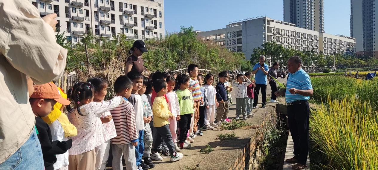 10月31日,DB视讯第一幼儿园中班3个班级的师生约120人,到实验中心水稻教学科研基地进行科普教育活动。中心杨培忠老师对前来参观的老师和小朋友进行科普分享。杨老师采用通俗易懂的语言分别从水稻栽培史,水稻新品种选育,水稻种植技术和水稻育种科学家等多方面进行讲解,让师生们初步认识了水稻基础知识,了解我们吃的米饭是怎样种植出来的;并鼓励小朋友长大后要当育种科学家,让他们认识到水稻种植的艰辛过程,引导他们不要浪费粮食。此外,本次活动还对小朋友们的疑问进行解答,现场参观了不同水稻品种的性状和水稻采收过程。中心伍朝荣博士陪同讲解。